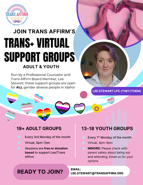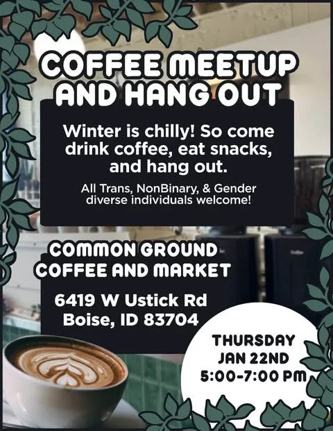 Weekly Support Groups Around the State Support Groups Boise | Garden City Trans Joy Boise (All Trans NonBinary & Gender Diverse) Follow on Instagram Boise Trans Collective | Boise HIVE (Trans) Follow On Instagram Trans Affirm | Virtual Support Groups for Adults & Youth (Trans+) Follow on Instagram Tri-States Transgender Support Groups | The Community Center (Transgender) Follow On Instagram Nampa | Caldwell Clutch Nampa Follow On Instagram Clutch Nampa | Thursday (18LGBTQ+) Follow On Instagram Clutch Nampa | Quarterly (18LGBTQ+) Website